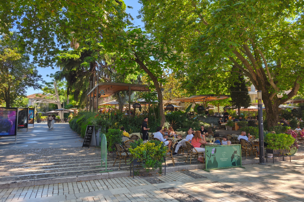 Gleich nebenan ist ein großer Shoppingtempel und die Restaurant- und Partymeile der Stadt. Wir haben uns ein albanisches Restaurant mit lokalen Speisen ausgewählt und hoffen, wir bekommen dort gleich einen Tisch.