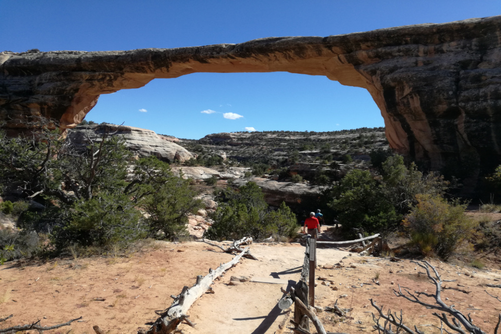 Oben war die Fahrbahn neu gemacht und die Fahrt zum National Bridges-Monument verging wie im Flug. Zwei der gigantischen Natur-Steinbrücken hatten wir vor vier Jahren schon erwandert, die Letzte haben wir uns heute Nachmittag angesehen.