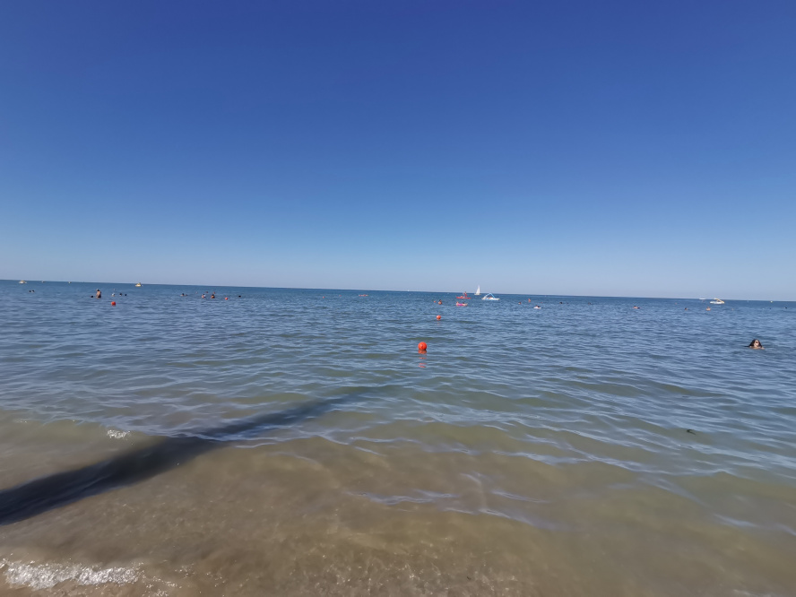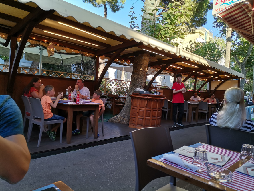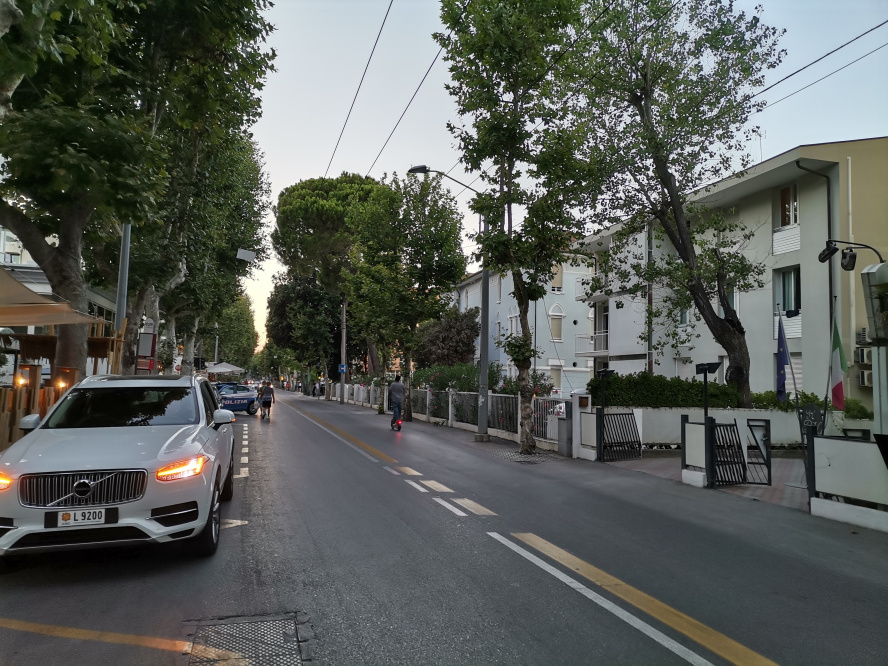 In Rimini das übliche Chaos auf der Straße und nachdem wir uns zweimal verirrt hatten, standen wir direkt vorm Hotel. Wie wir aus dieser Parklücke im Hof je wieder raus kommen wollen, ist uns ein Rätsel. Das Hotelzimmer ist modern, aber extrem klein. Ein Strandschirm kostet hier mit Hotelrabatt 18 € am Tag. Es ist halt Rimini. Das Wasser hat Badewannentemperatur. Das können wir dann morgen ausgiebig nutzen.