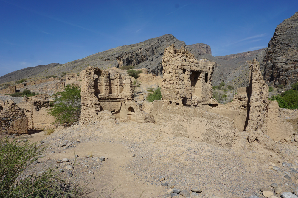 Zuerst ging es zu den Ruinen von Tanuf. Das ist ein zerbombtes altes Dorf. Trotz der Zerstörung konnte man sehr gut die alte Bauweise erkennen und auf welch kleinem Raum die Menschen gehaust haben. Dahinter befand sich der Wadi Tanuf, gerühmt für seine Pools. Leider im Moment ohne einen Tropfen Wasser. Das war dann nix.