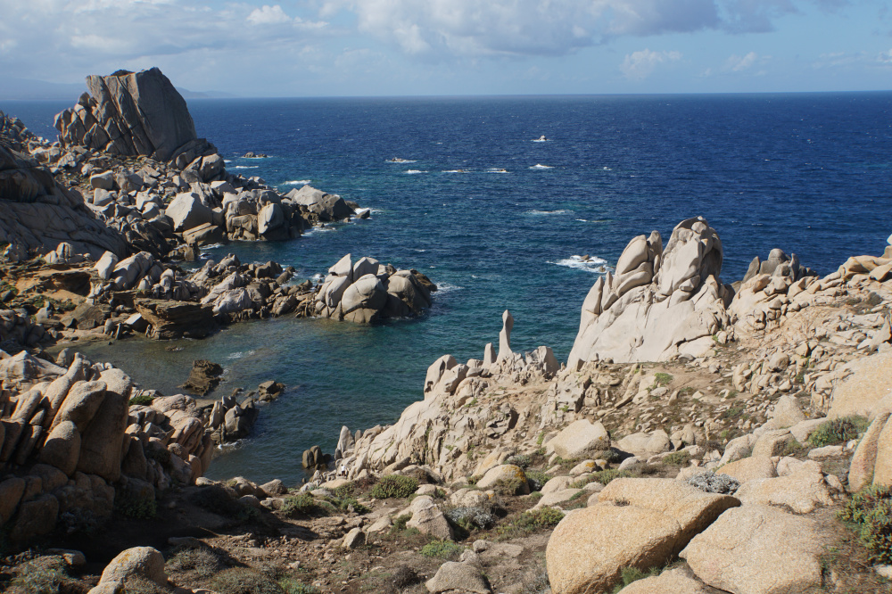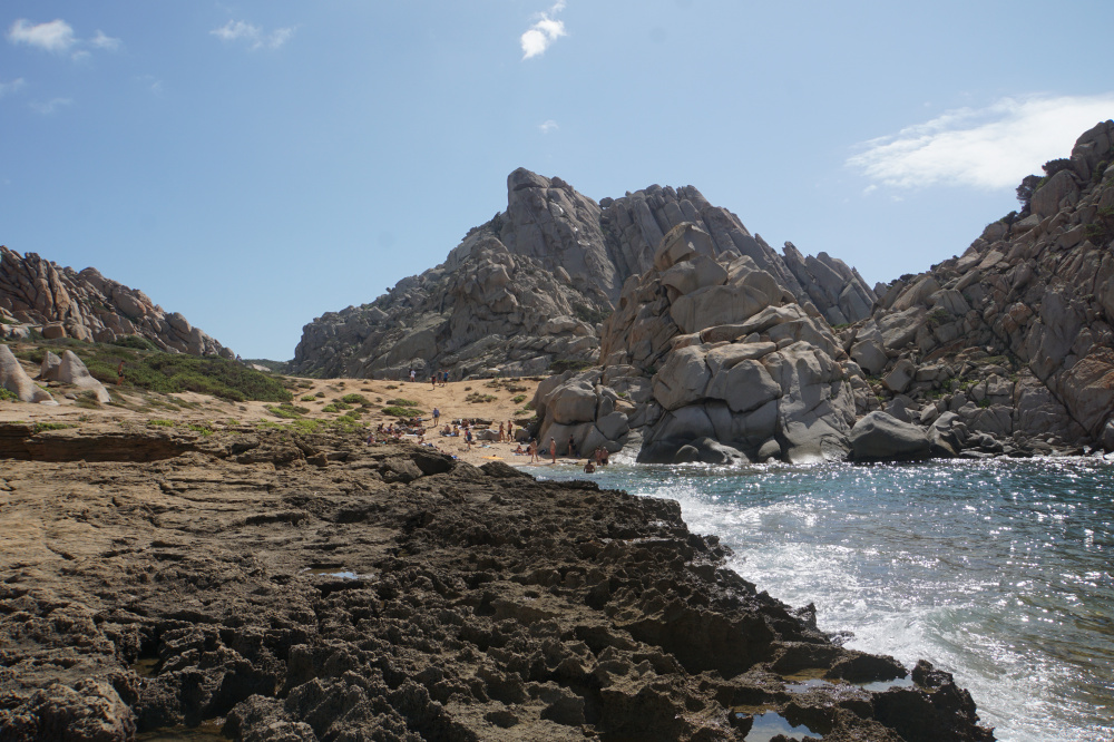 Dieser lag auf der Halbinsel Capo Testa. Diese ist berühmt für ihre Felsenbuchten und schönen Gesteinsformationen. Das Parken wurde wie immer zum Problem. Glücklicherweise ist jemand aus seiner Lücke direkt vor uns gefahren. Vier Euro für zwei Stunden bezahlt und dann sind wir zum ersten Buchtausblick gelaufen und zum Leuchtturm. Die Sonne brannte heiß, wenn sie aus den Wolken kam. Für Erfrischung sorgte eine echt steife Briese.