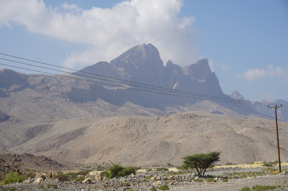 Wir sind im Hajar-Gebirge. Es ist Abend und wir haben hier das erste Mal lange Hosen an und eine Jacke, denn es ist hier in der Höhe von fast 2000 m frisch und etwas windig. Der 3009 m hohe Jabal Shams liegt fast gegenüber unserer Unterkunft. Dazwischen nur der der Grand Canyon des Omans. Ein imposanter Anblick.