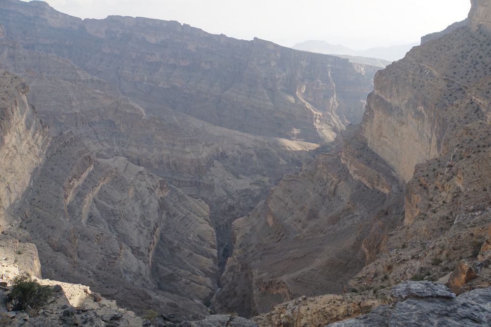 Überhaupt ist man Selbstversorger und wir sind mit omanischem Brot in zwei verschiedenen Varianten, Frischkäse, Käse, Croissants, Muffins und unserer alkoholfreien Lorke bestens versorgt. Wir haben eine Kleinigkeit gegessen und sind danach zu einer kurzen Wanderung aufgebrochen. Hinweisschilder waren wie immer Fehlanzeige und so mussten wir den Eingang zum W4 - Wanderweg eine Weile suchen. Es war auch weniger ein Wanderweg als eine Kletterei über Stock und Stein. Am Ende dieses Weges befindet sich eine Klettermöglichkeit und wir haben beobachtet, wie sich Menschen in den Canyon abgeseilt haben. "Im Leben nicht" ist unser beider Meinung. Allerdings ist der Blick in den Abgrund schon spektakulär.