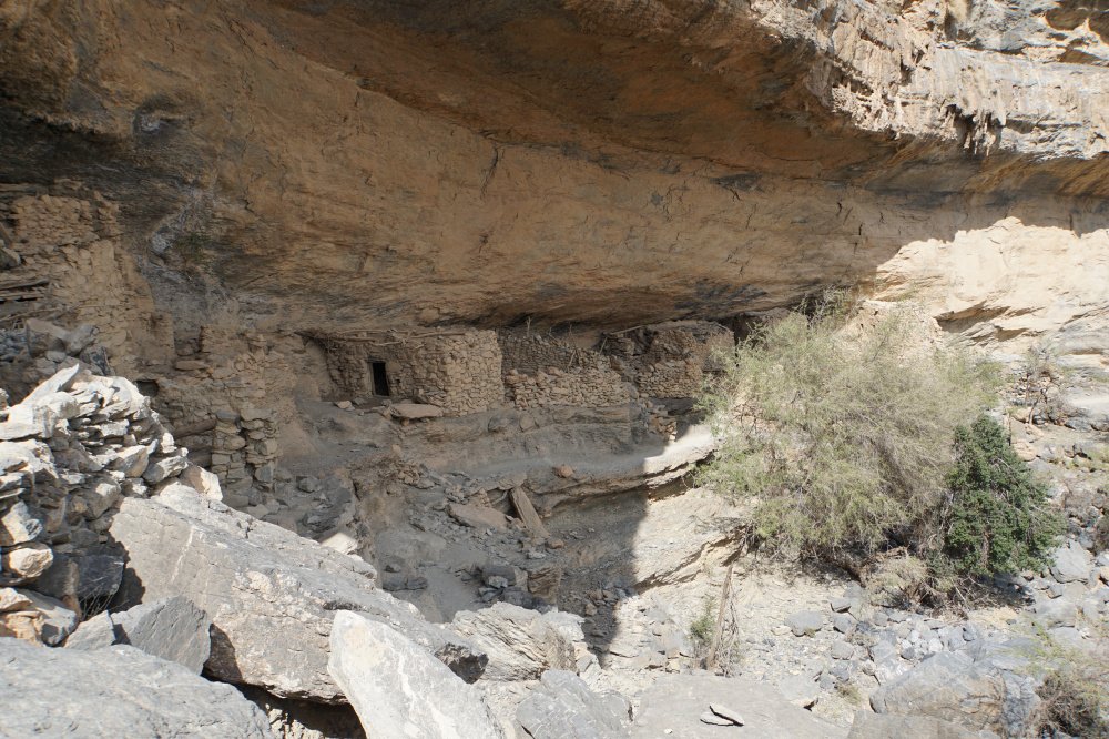 Unser Weg war heute das Ziel: eine Wanderung über Stock und Stein entlang des Wadi Nakhar, der oft als der Grand Canyon des Oman bezeichnet wird. Man läuft auf einem spektakulären Balkonweg entlang des ca 1000 m tiefen Abgrunds 4,5 km eine Strecke. Der Weg führt vorbei an jeder Menge Steine (und auch darüber hinweg), Ziegen und alten Behausungen von Hirten. Dabei wird der Blick immer wieder magisch von den Lichtspielen auf den Felsformationen angezogen, die durch die Wolken entstehen. Man steigt in paar hundert Meter an der Felswand hinunter bis zum Entstehungspunkt des Wadis. Der befindet sich genau an der Stelle, wo wir gestern die Kletterer beobachtet haben. Es ist zu Beginn des Winters im Oman zu trocken, so dass sich leider kein Wasserfall in die Schlucht ergießt. Dort haben wir nach anderthalb Stunden Rast gemacht, Cracker gegessen und diese erfolgreich gegen bettelnde Ziegen verteidigt.