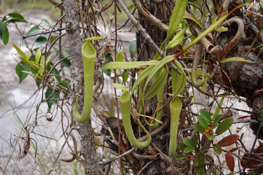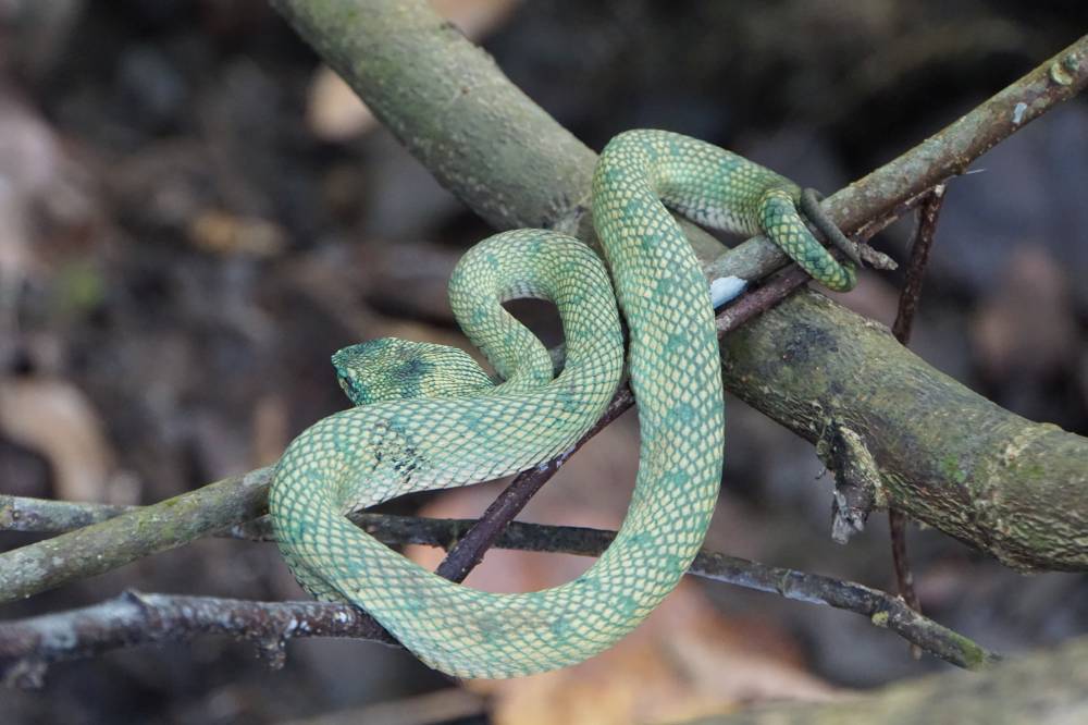 Zuerst entdeckte Alex zwei Baumvipern, die wir im Leben nicht gesehen hätten. Die sind giftig, aber sehr friedlich. Da noch keine Affen zu sehen waren, entschieden wir uns, zuerst zu wandern. Wir stiegen über Wurzeln und Leitern zum höchsten Punkt der Halbinsel und durchquerten dabei verschiedene Vegetationszonen. Alex wurde nicht müde, uns auf jede Menge Tiere und Pflanzen aufmerksam zu machen. So entdeckten wir Krabben, Bartschweine, wilde Bienen, diverse fleischfressende Pflanzen und Symbiosen zwischen Ameisen und Pflanzen.