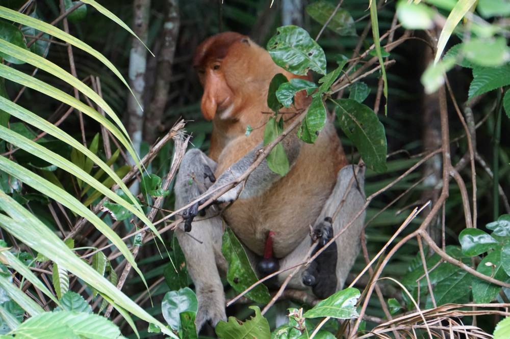 Das Mittagessen war im Reisepreis inbegriffen, bestand aus einheimischer Kost und war lecker. Dabei konnten wir beobachten, wie die frechen Makaken anderen Touristen die Snacks klauten. Wir gingen nach dem Essen erneut auf Affensuche und hatten Glück. Ein Nasenaffe hatte sich beim Futtern ca. 2 Meter entfernt in Position gebracht. Diese Tiere sind sehr gemütlich und lassen sich nicht stören. 3 Bäume weiter zeigte uns Alex noch eine kleine Affenart, die nur auf Borneo existiert. Davon hatte sich gleich eine ganze Familie versammelt und tobte in den Bäumen herum.