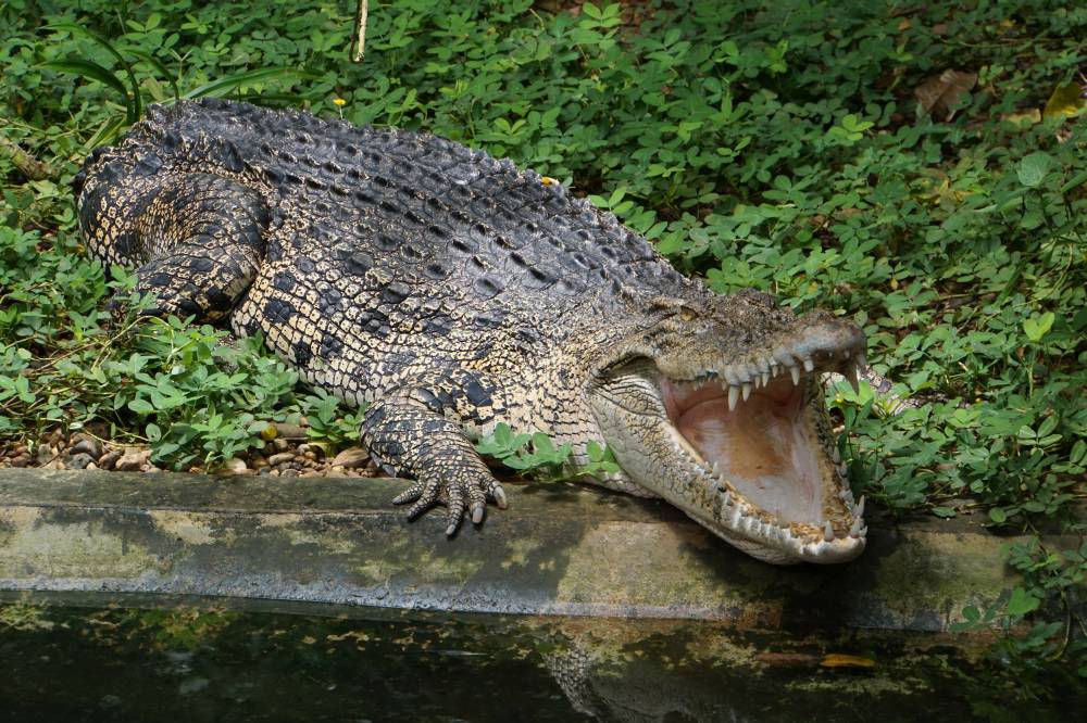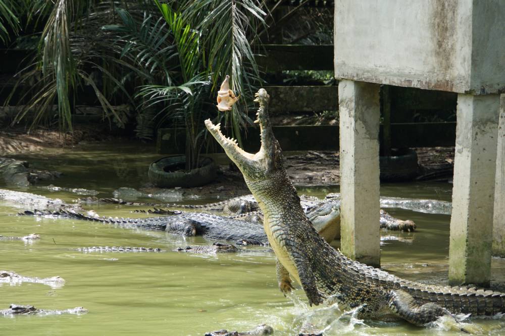 Unser Fahrer - Wah - holte uns vor dem Hotel ab und fuhr mit uns zu Jongs Krokodilfarm. Das ist, wie der Name schon sagt, eine Zuchtfarm mit anhängigem Zoo. Wir trafen dort pünktlich zur Fütterung ein und konnten gut beobachten, wie die Krokos mit dem ganzen Körper aus dem Wasser sprangen, um ein Hähnchen zu ergattern. Das Geräusch der zuklappenden Mäuler ist beeindruckend. Hinterher sind wir durch den Zoo gebummelt und konnten noch jede Menge Reptilien und andere Tiere beobachten. Richtig putzig war ein kleiner Malaienbär. Besonders beeindruckend war ein Teich mit Unmassen an Arapaimas. Sie gehören zu den größten Süsswasserfischen der Welt. Und tatsächlich entdeckten wir auch mehrere Brocken, die um die 2 Meter groß waren.