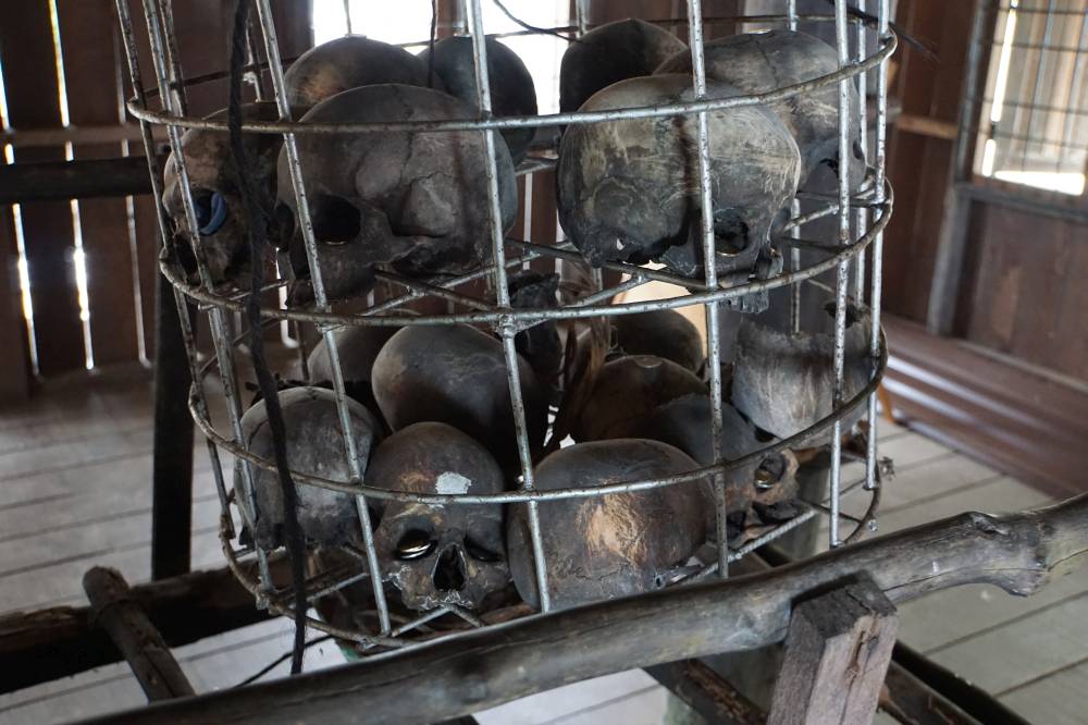 Nach dem Zoo fuhren wir mit unserem Kühlauto eine Stunde nach Süden, um der Bidayuh-Gemeinschaft einen Besuch abzustatten. Das ist einer der Stämme Malaysias, die noch sehr tradionell leben. Ihre Wohnraum ist auch heute noch das ursprüngliche Longhouse. Das sind Pfahlbauten, Wand an Wand, die sich links und rechts an einem großen offenen Gemeinschaftsraum mit Küchen entlangziehen. Hier findet das öffentliche Leben statt: Handel, Gewerbe, Kochen. Jede Familie bewohnt einen großen Raum mit Vorratsdachboden, in dem sich das private Leben abspielt. Aber immerhin mit WC. In einem original nachgebildeten Ausstellungsraum konnten man auch die Relikte der kriegerischen Auseinandersetzungen mit anderen Stämmen betrachten: Totenschädel. Echte. Je mehr eine Familie hatte, desto größer war ihr Ansehen als Krieger.