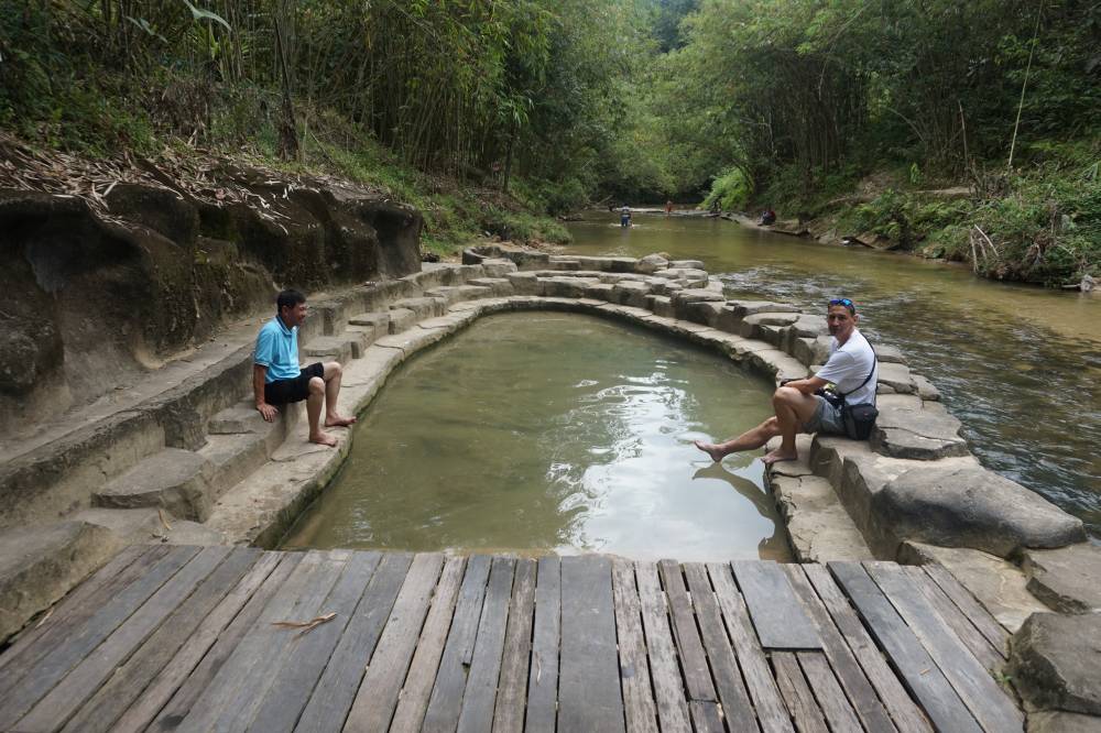 Zum Abschluß unserer Tour brachte uns Wah zu einem Fluß, in dessen Mitte 3 heiße Quellen sprudeln. Eine war warm, die zweite heiß und in der Dritten blubberte es ordentlich. Einheimische sagten, dass man darin Eier kochen kann. Da sind wir doch lieber mit den Füßen im kühlen Fluß herumgestiegen.