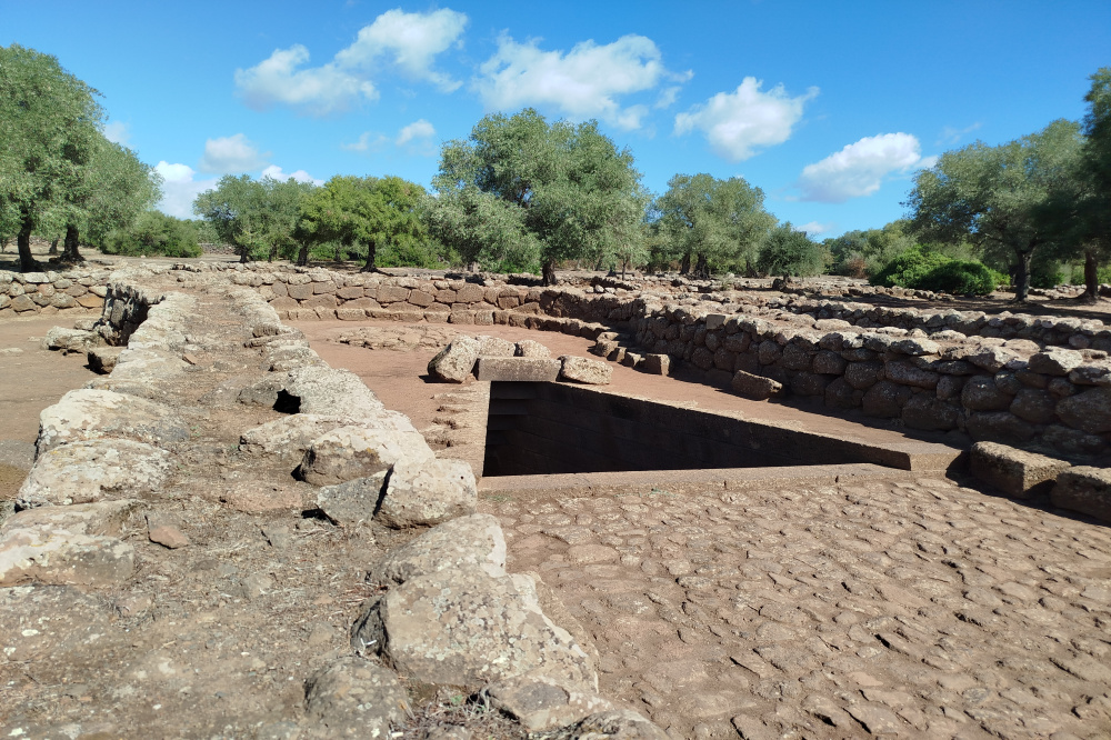 Zuerst sind wir zur archäologische Ausgrabung Santa Cristina gefahren, eine dreiteilige Anlage: ein sardischer Brunnentempel in Form eines Stufenbrunnen, eine Nuraghenanlage mit Turm und eher seltenen Langbauten und ein aus dem 12 Jahrhundert stammendes Kloster. Beeindruckend war besonders die Architektur des Brunnentempels und das sich verengende Gewölbe mit Lichtloch über dem Wasser.
