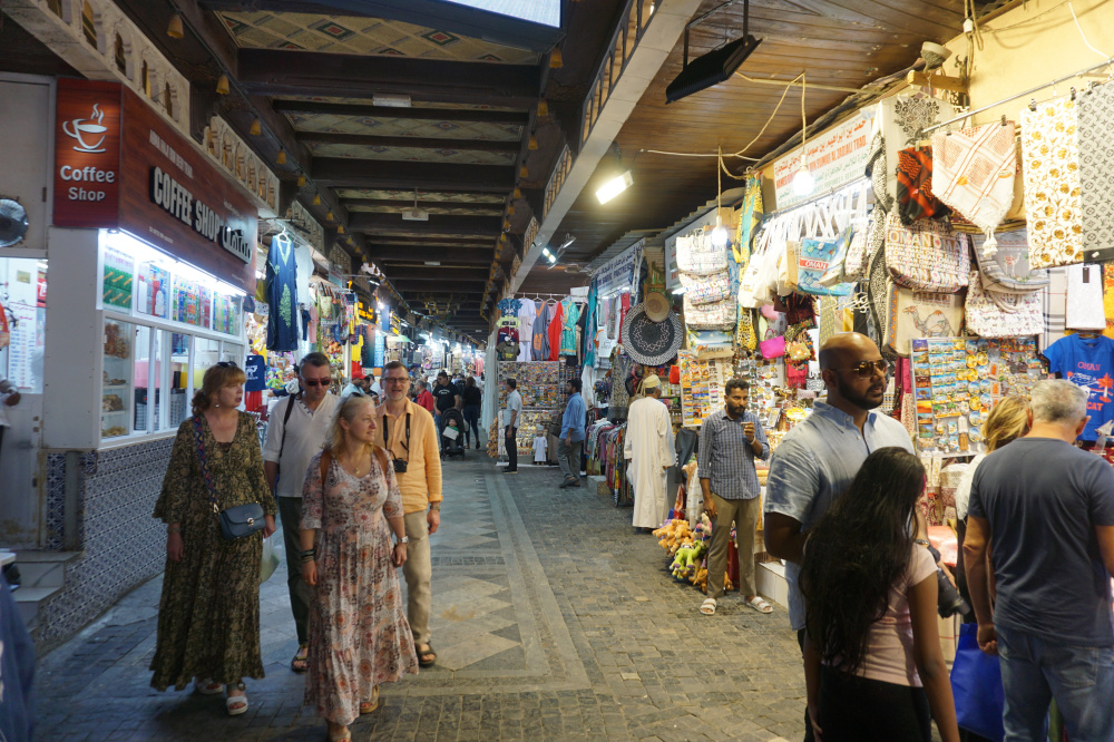 Fast am Ende der Bucht steht eine alte Burg. Man bezahlt drei Rial pro Person, steigt jede Menge Stufen hoch und wird mit einer tollen Aussicht belohnt. Ansonsten gibt die Burg nicht viel her. Dann ist es nicht mehr weit zu einer weiteren Attraktion: dem Souq. Das ist ein Basar mit vielfältigem Angebot: Schmuck, Kitsch, Stoffen und Tücher. Leider auch ganz viel industriell hergestellter Tinnef. Und über Allem waberte Weinrauch-Nebel. Das und das penetrante Nötigen zum Einkauf haben uns nach zehn Minuten wieder vertrieben. Es gab auch nicht wirklich Etwas, das uns interessiert hätte.