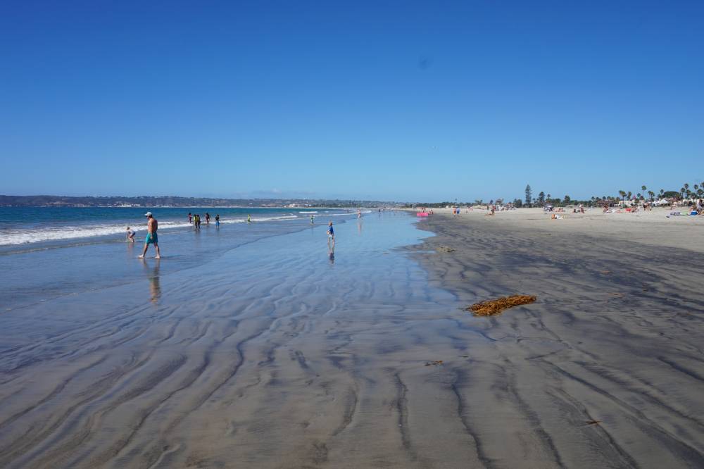 Nach der Fährfahrt liefen wir 11 Blocks weit durch ein sehr hübsches Wohngebiet zum pazifischen Strand. Dort besuchten wir zuerst das 1888 erbaute Luxushotel Del Coronado, welches schon als Filmkulisse für 'Manche mögens heiß' diente. Dann suchten wir uns ein schönes Plätzchen am Strand und ließen 3 Stunden die Seele baumeln. Das, was auf dem Foto im Sand schwarz aussieht, flittert in der Sonne golden. Die Wassertemperatur wissen wir nicht, es fühlte sich aber wie über 20 °C an. Am laut Ranking schönsten Strand der USA (vor Hawai !!!) haben wir noch mal schön Farbe zugelegt.