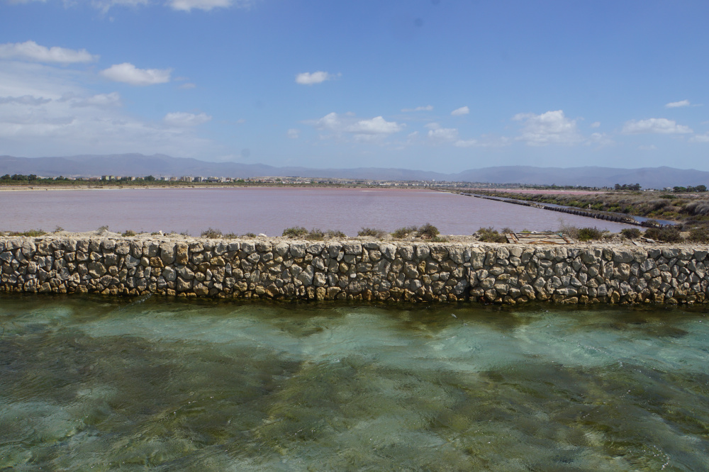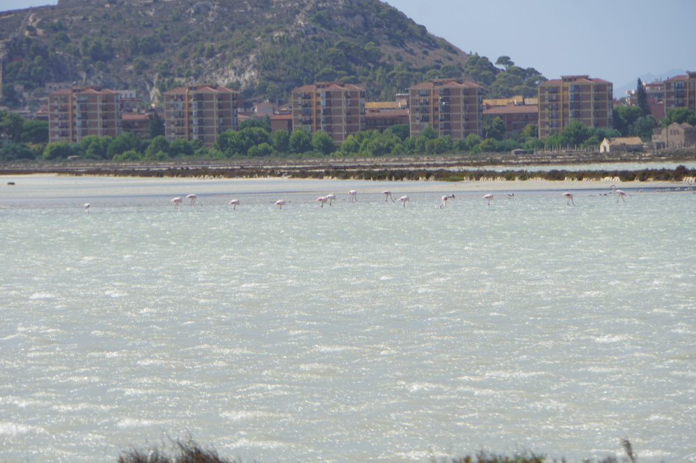 Interessant ist das Farbenspiel der einzelnen Wasserflächen und in Einem davon standen Flamingos. Man kann bequem am Zulauf des Meereswassers entlang spazieren und Fische beobachten, die Flamingos und Reiher. Danach haben wir uns mit einem letzten langen Blick von Strand und Meer verabschiedet.