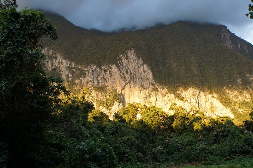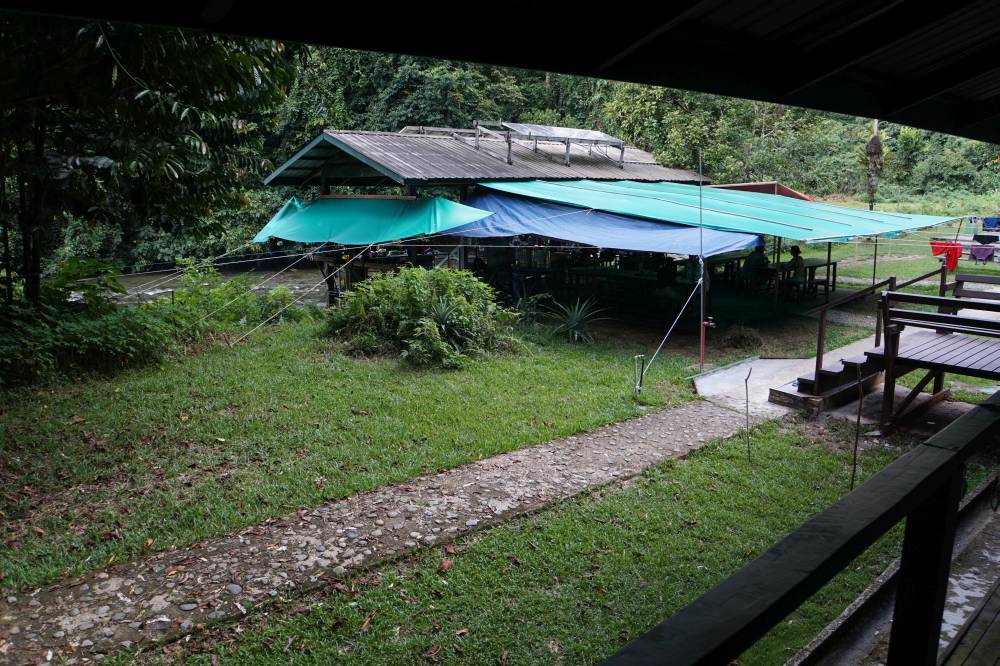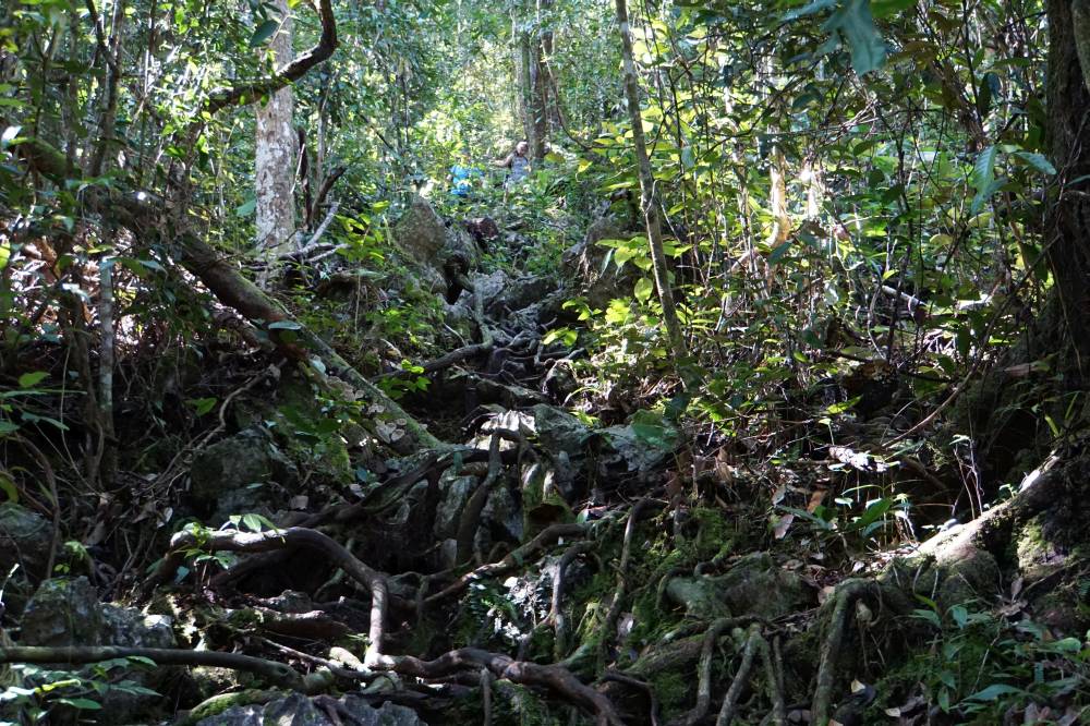Nach einer sehr sehr kurzen Nacht (Dschungel zu laut, Bett zu hart, und unterm Moskitonetz zu warm) starteten wir 6:30, jeder bewaffnet mit 4,5 Liter Wasser und Regenschutz, zu unserer Bergwanderung. Nach 500 ebenerdigen Metern ging es ab in eine 45 Grad steile Wand und wir begannen zu klettern mit Hilfe von Seilen und Lianen über Wurzeln und Felsen und durch vieeel Matsch. Nach 10 Minuten waren alle Klamotten und der Körper klatschnass und nach einer halben Stunde waren die ersten 1,5 Liter Wasser alle. Unser Tempo: 20 Schritte, 20 Sekunden Pause. 1,5 Stunden später hatten wir 450 Höhenmeter überwunden und das Ende der ersten Sektion erreicht. Da es ab jetzt noch schwieriger geworden wäre und wir eh zu langsam waren (Erster Teil normalerweise eine Stunde), beschlossen wir mit Christopher und unseren Zimmergenossen auf die nächsten 4 Stunden und 2000 Meter Aufstieg zu verzichten (wie 80% aller Starter). Nach einer längeren Pause begannen wir mit dem Abstieg. Dieser dauerte 2 Stunden und war wesentlich gefährlicher als der Weg nach oben. Wir haben uns jede Menge blaue Flecken und Kratzer zugelegt.