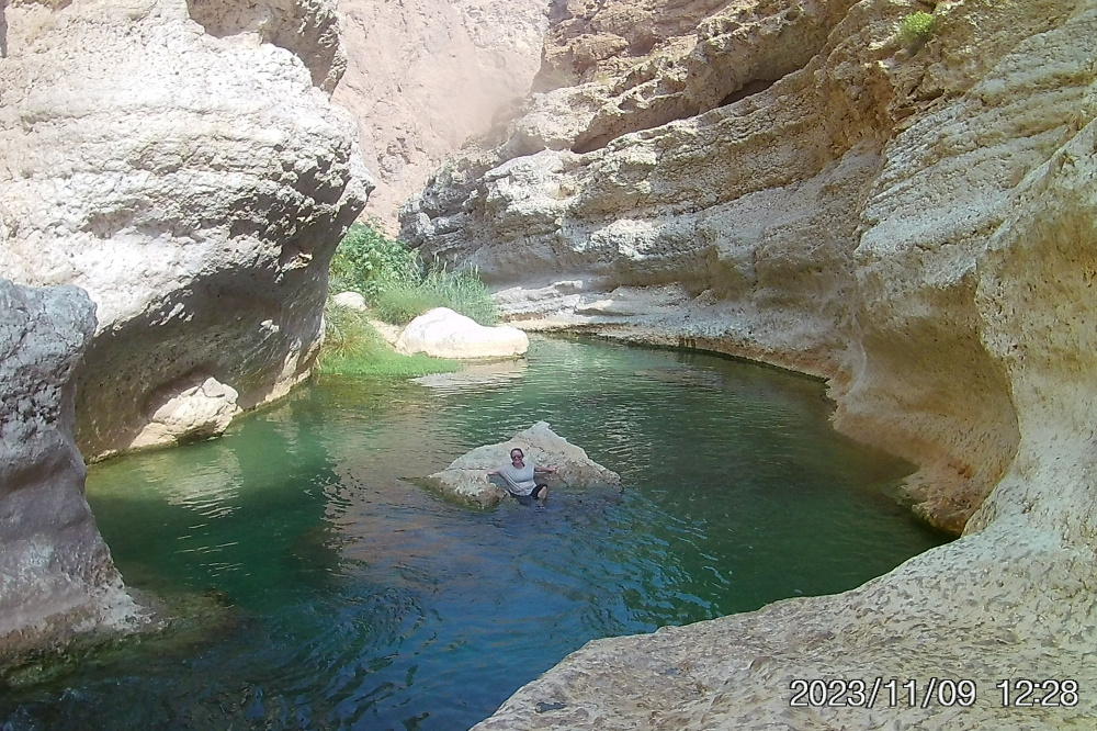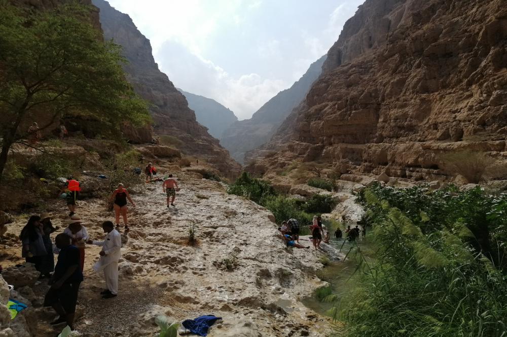 Wir parkten Das Monster, checkten das Örtchen zwecks späterer Umzieherei, schulterten den Wasserrucksack und los ging es. Man zahlt einem freundlichen Omani 1 Rial und wird mit einem Motorboot auf die andere Seite der Lagune gebracht, die mit Lotos schön anzuschauen war. Die erste Strecke der Route führt durch Gärten mit besagtem Obstanbau. Danach wanderte man direkt an der Felsenwand am Abgrund entlang. Der dritte Abschnitt war mit etwas Kletterei verbunden. Man kreuzte mehrfach das Gewässer, so das die Schuhe beizeiten nass waren. Nach ca 45 Minuten erreicht man das Ende des fußläufigen Teils. Wanderschuhe in Wasserschuhe getauscht und hinein ins Wasser in voller Montur. Auf einer Länge von etwa 500 Metern liegen verschieden tiefe Pools. Man muss schwimmen, klettern und hat auf den oft glatten Steinen jede Menge Gaudi.