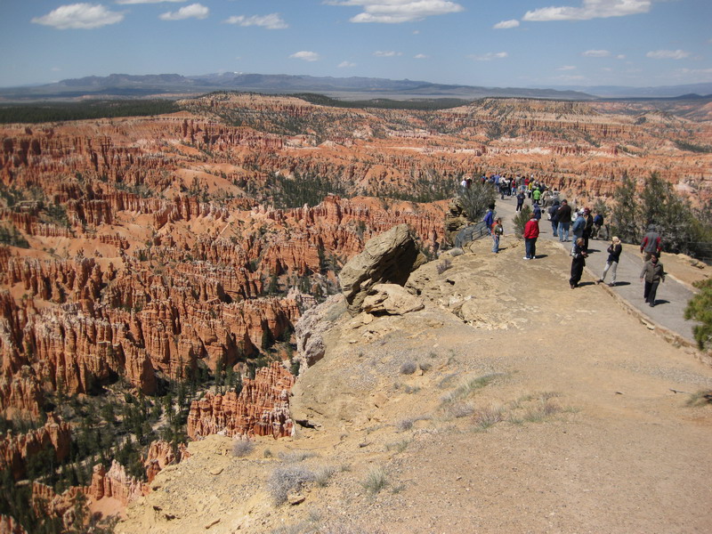 Die Hauptattraktion des Tages war aber der Bryce Canyon. Es sah auf den ersten Blick wie die farbenfrohe Kleckerburg eines überaus begabten Riesenkindes aus. Man wußte nicht, wohin man zuerst schauen sollte. Aller paar Schritte boten sich neue Perspektiven, was zum wiederholten Male in einer Bilderflut gipfelte. Allerdings musste man aufpassen, das einen der Wind nicht in den Canyon blies.