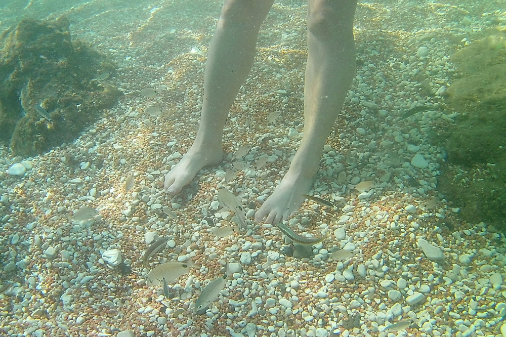 Dann haben wir das Badezeug gerafft und sind zu einem Strand etwas abseits des Touristengetümmels gefahren. Im Wasser konnten wir dank Schnorchelmaske die Fische auch sehen, die uns in die Waden gezwickt haben.