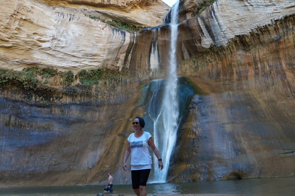 Das neue Ziel war ein Wasserfall, genannt Lower Calf Creek Fall. Ein abwechslungsreicher 5 km langer Hinweg, an dessen Ende ein wunderschöner Wasserfall lag mit einem Felsbecken zum Baden. Leider betrug die Wassertemperatur nur etwa 14 °C, also wurden nur die Füße getaucht. Der Rückweg verging wie im Flug => HUNGER.
