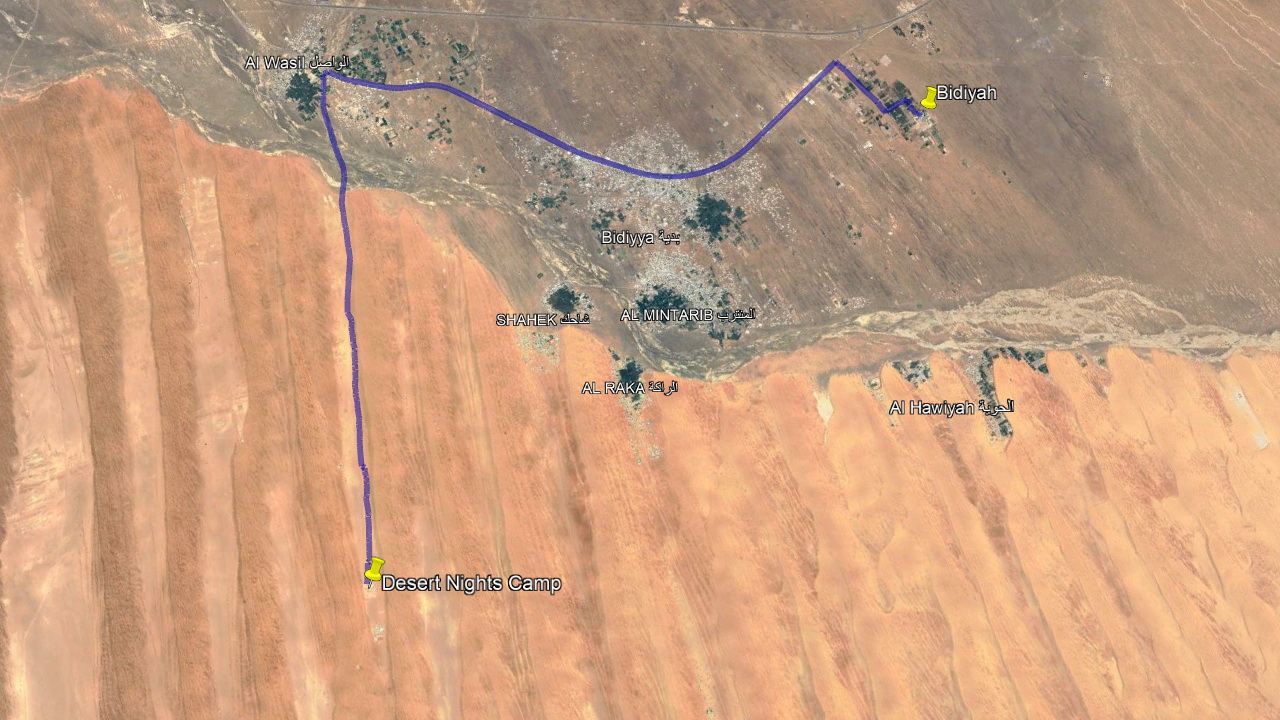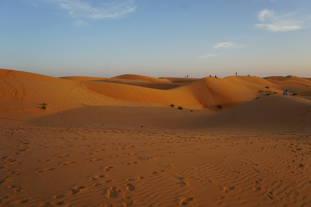 Im Koffer packen sind wir wieder mittlerweile Profis und wir waren echt froh, dieses Resort verlassen zu können. Der Weg führte uns an Biddiya vorbei zur letzten Tanke vor der Wüste. Der nette Tankwart tankte voll und der ebenso nette Mechaniker ließ 20 Prozent Luft aus den Reifen für die Fahrerei im Sand. Und dann ratterten wir los auf der Waschbrett-Fahrbahn 11 km in die Wüste hinein. Viel Sand, etwas Buschwerk und einige Kamele später erreichten wir das Desert Nights Resort, eine umzäunte Ansammlung von Zelten und Bungalows in diversen Preislagen. Wir hatten die Deluxe-Option gebucht. Diese beinhaltete heute einen Sonnenuntergang auf der Düne mit Getränk (was man natürlich bezahlen muss) oder morgen in aller Herrgottsfrühe einen Dromedarausritt in den Sonnenaufgang. Wir wählten Option 1. Man wurde mit einem Landcruiser im Affenzahn die Düne hochgefahren, erwarb ein richtiges Bier und plauderte mit netten Menschen bis zum Sonnenuntergang. Der sehr schöne Bilder lieferte. Wir ersparten uns die Warterei aufs Auto und stiefelten danach die Düne zum Camp hinunter. Vor unserem Bungalow haben wir jede Menge Sand aus Schuhen und Socken geschüttet und den Rest vom Kadaver gespült. Mit warmen Wasser. In der Wüste. Irgendwie dekadent.